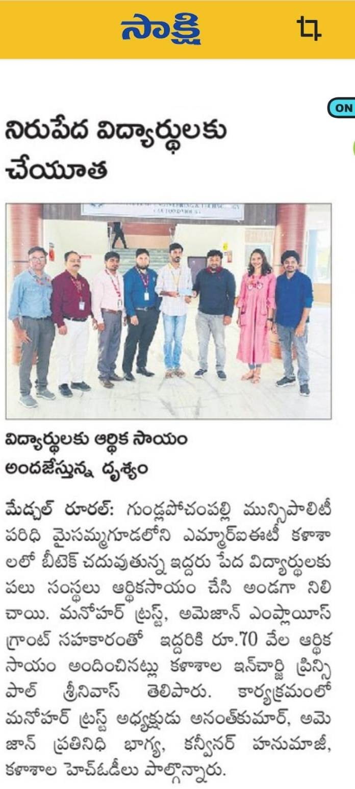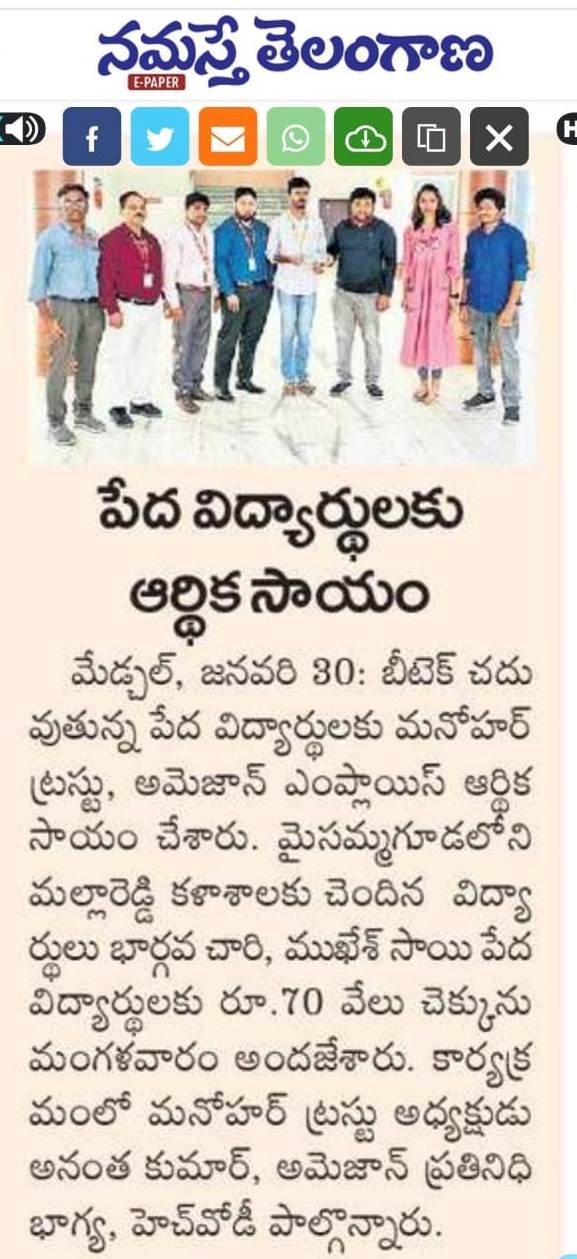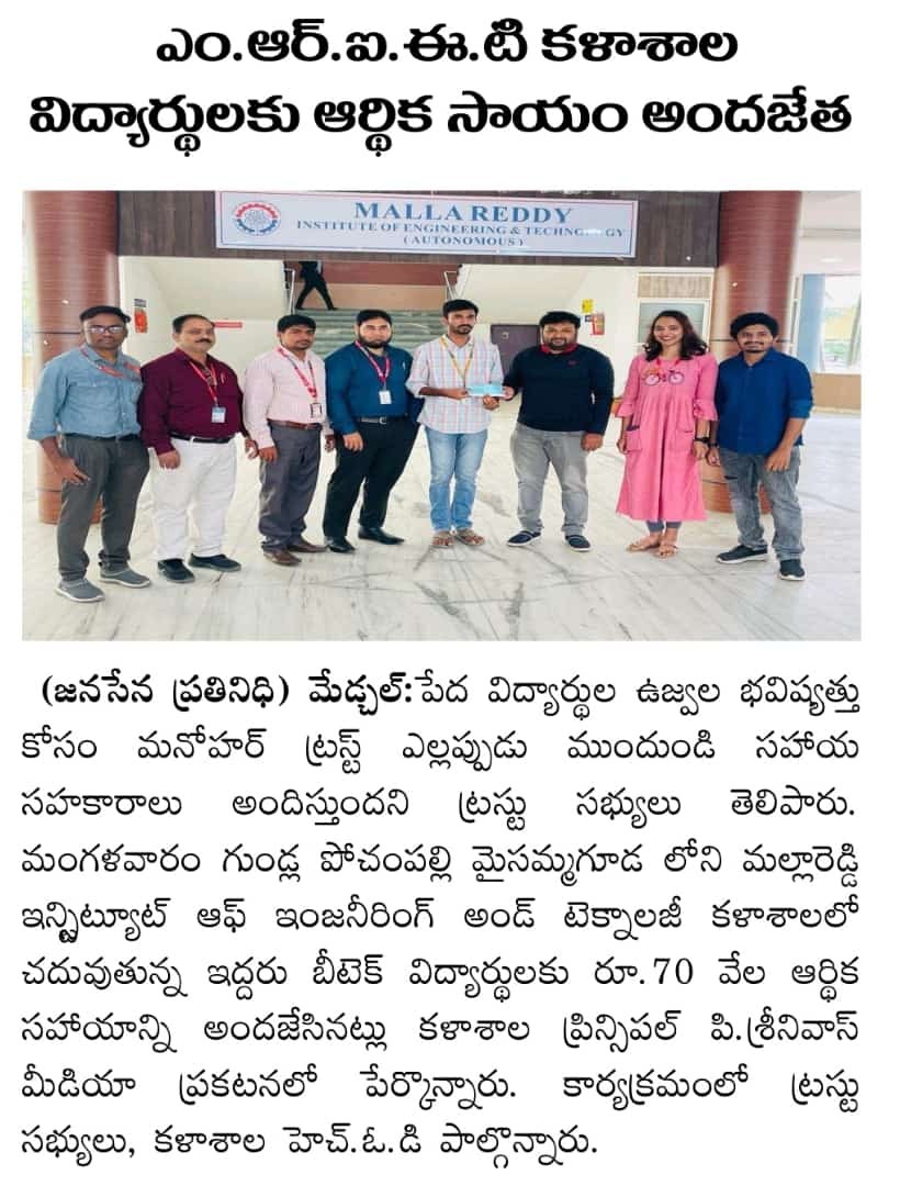 Manohar Trust extended financial support to deserving students pursuing higher education. As part of this initiative, educational aid of Rs. 30,000 was provided to K. Bhargav Chary, a B.Tech III Year ECE student, and Rs. 40,000 was provided to P. Sai Mukesh, a B.Tech IV Year IT student, studying at Mallareddy Institute of Engineering and Technology (MRIET), Dhulapally, Secunderabad on 27.01.2024.
