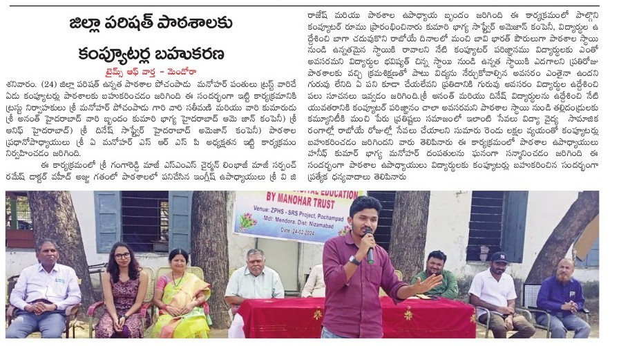 Manohar Trust, as part of its commitment to improving educational infrastructure in rural areas, donated benches with desks to the primary school at Seetharampally Tanda. This initiative was taken to create a better learning environment for the children, many of whom previously had to sit on the floor during classes.